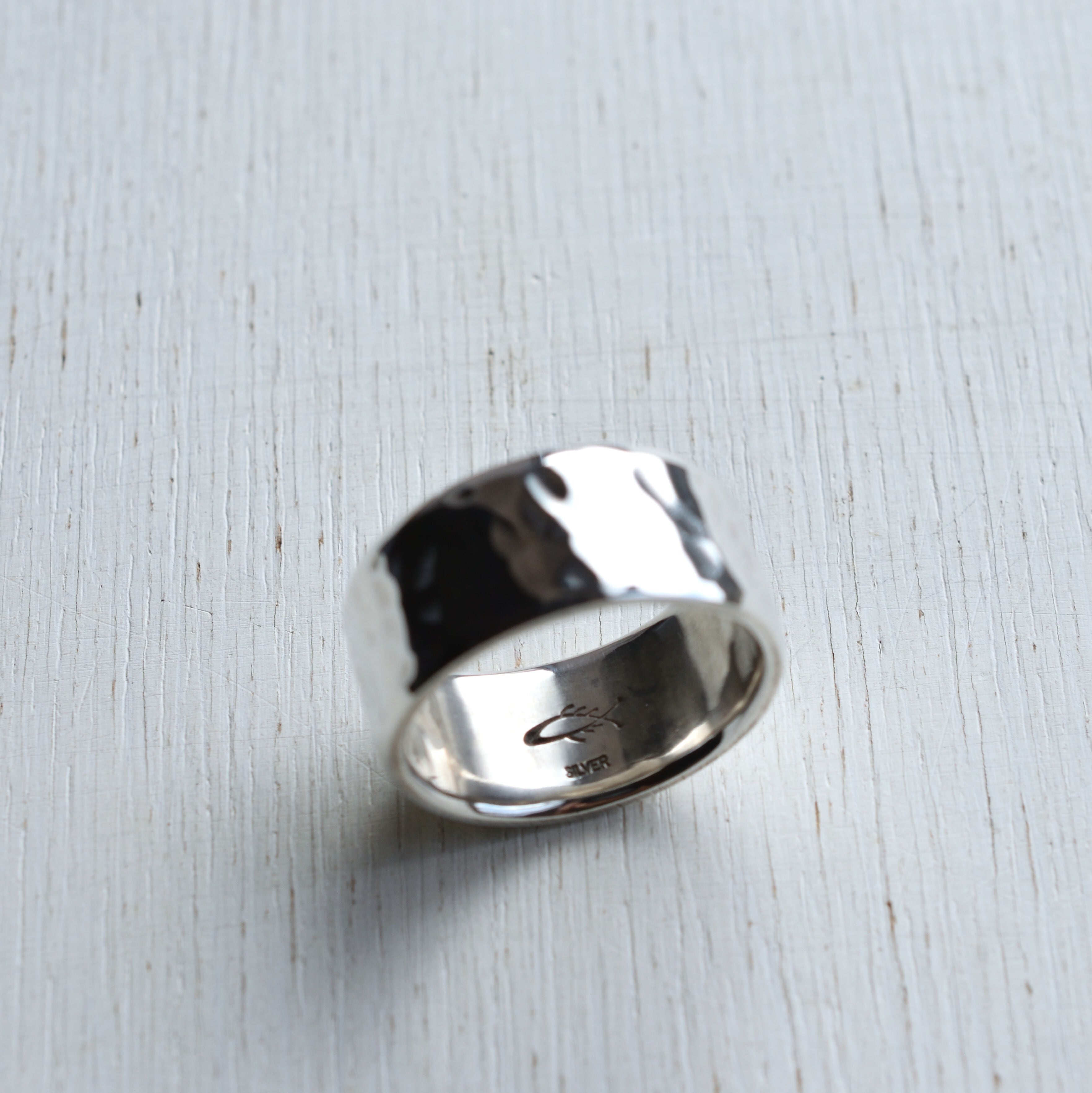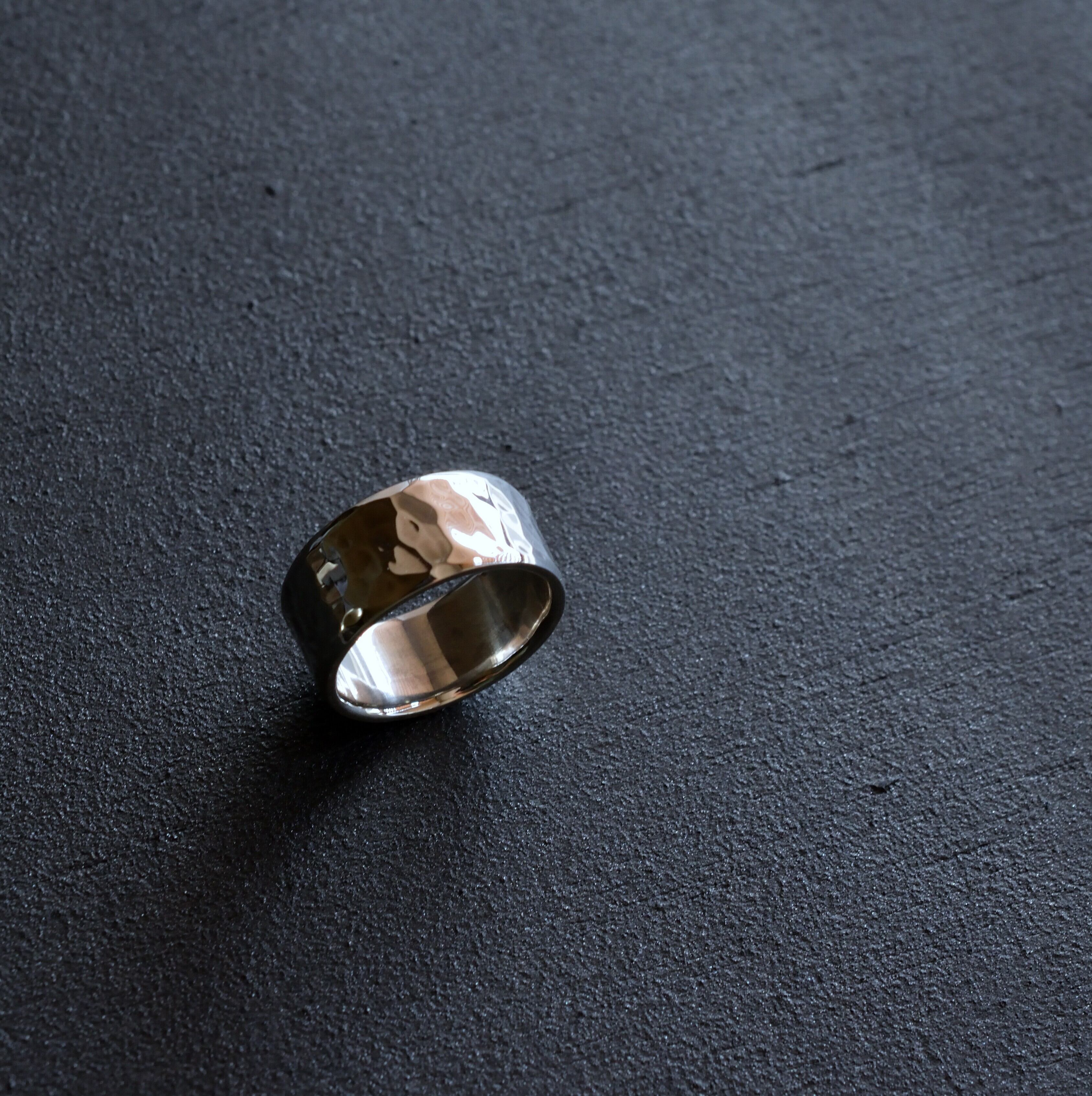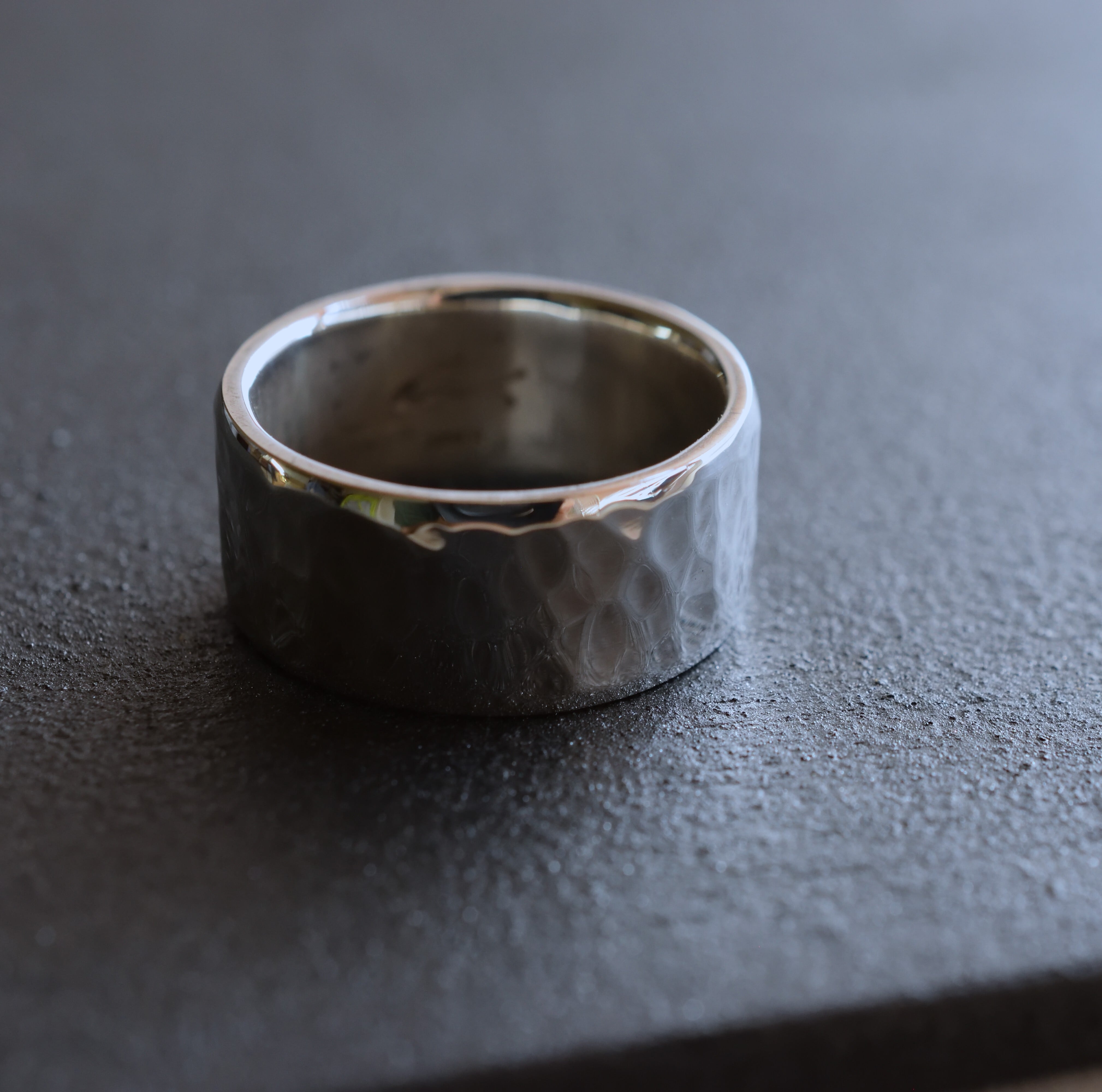 槌目打ちの技法で制作するSV950の指輪。幅10mm。