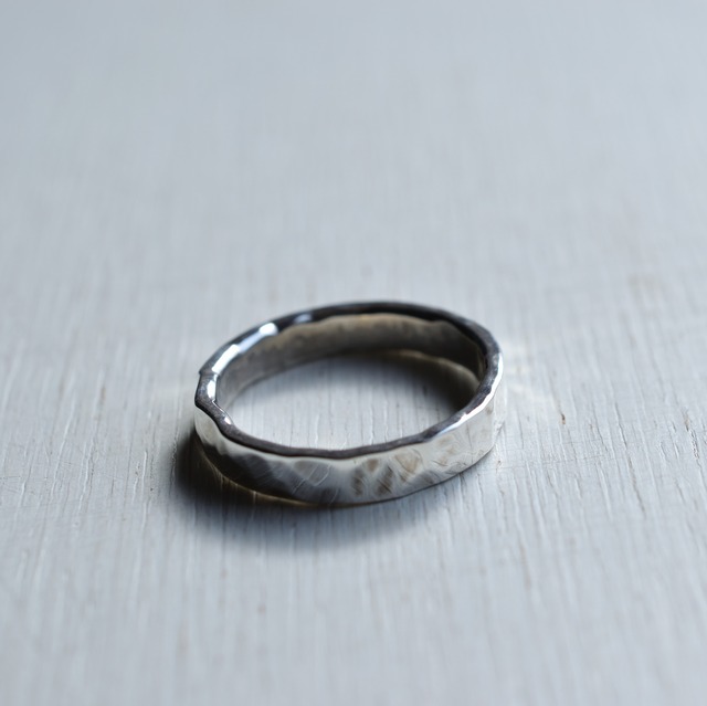 リングの上下のラインは、打ち付けた際にできる歪みをあえて残し、手仕事の風合いを大切にしました。