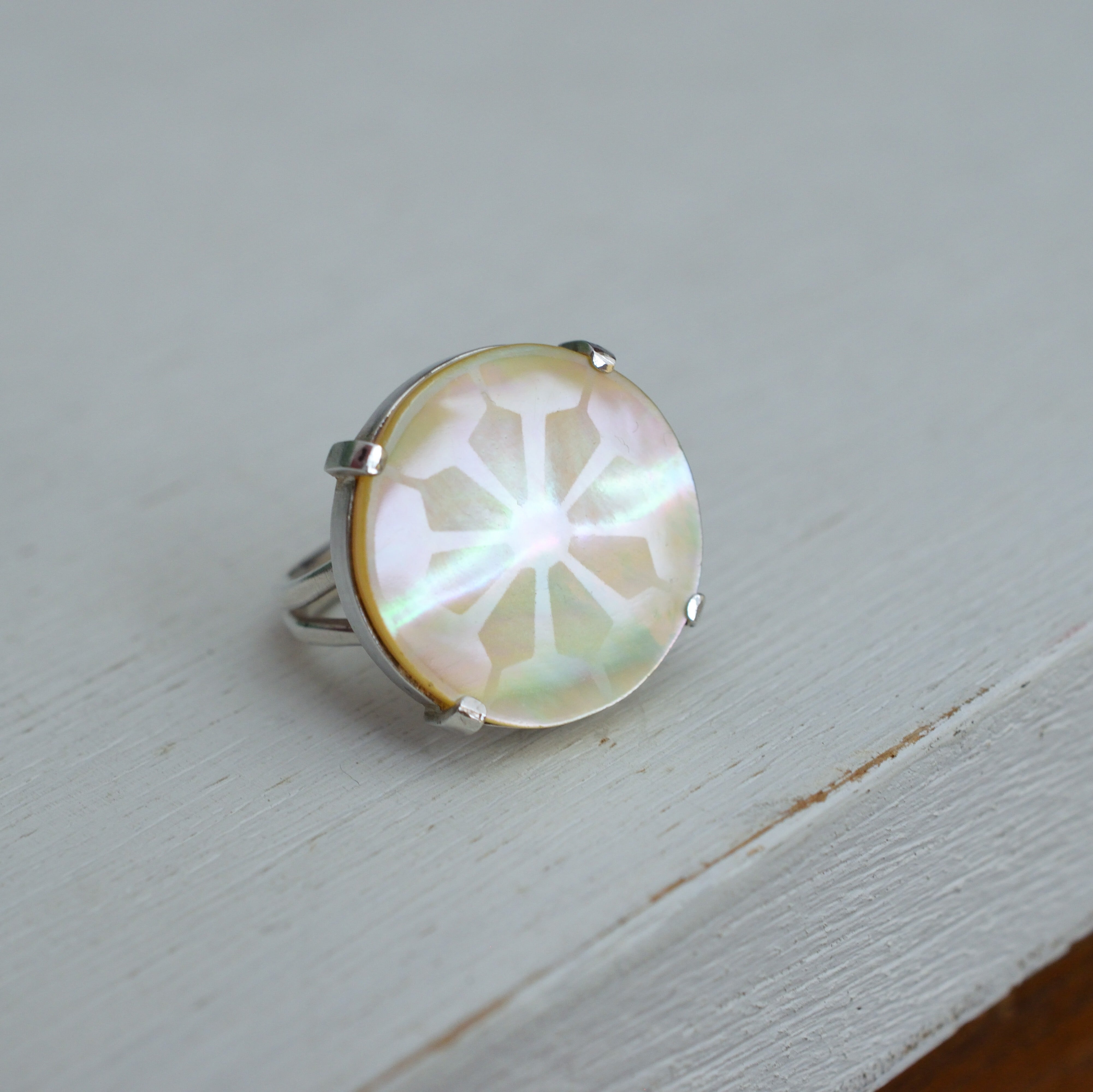 磨き上げた蝶貝(MOP)に日本の伝統文様を刻み込んだつや消し仕上げのシルバーリング。