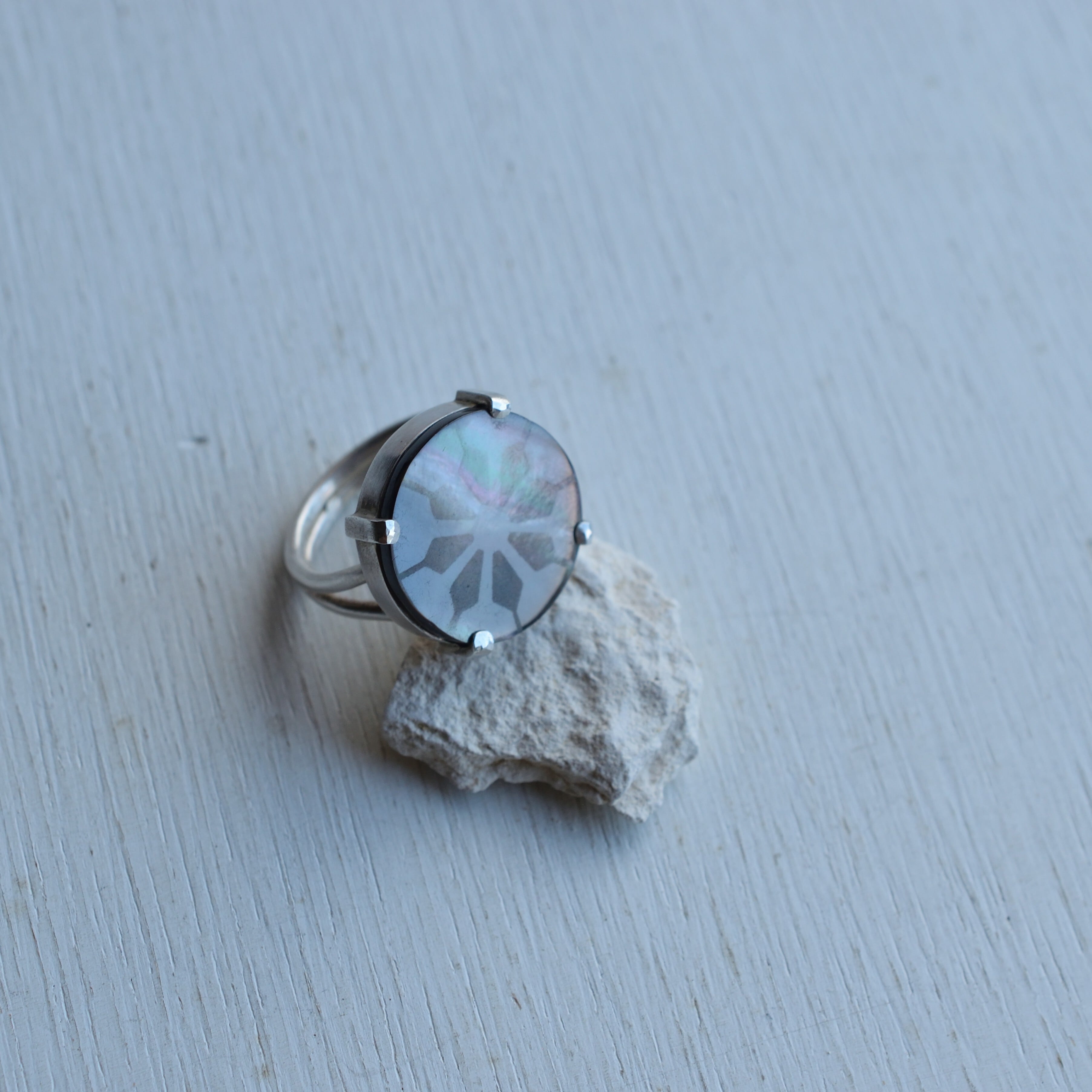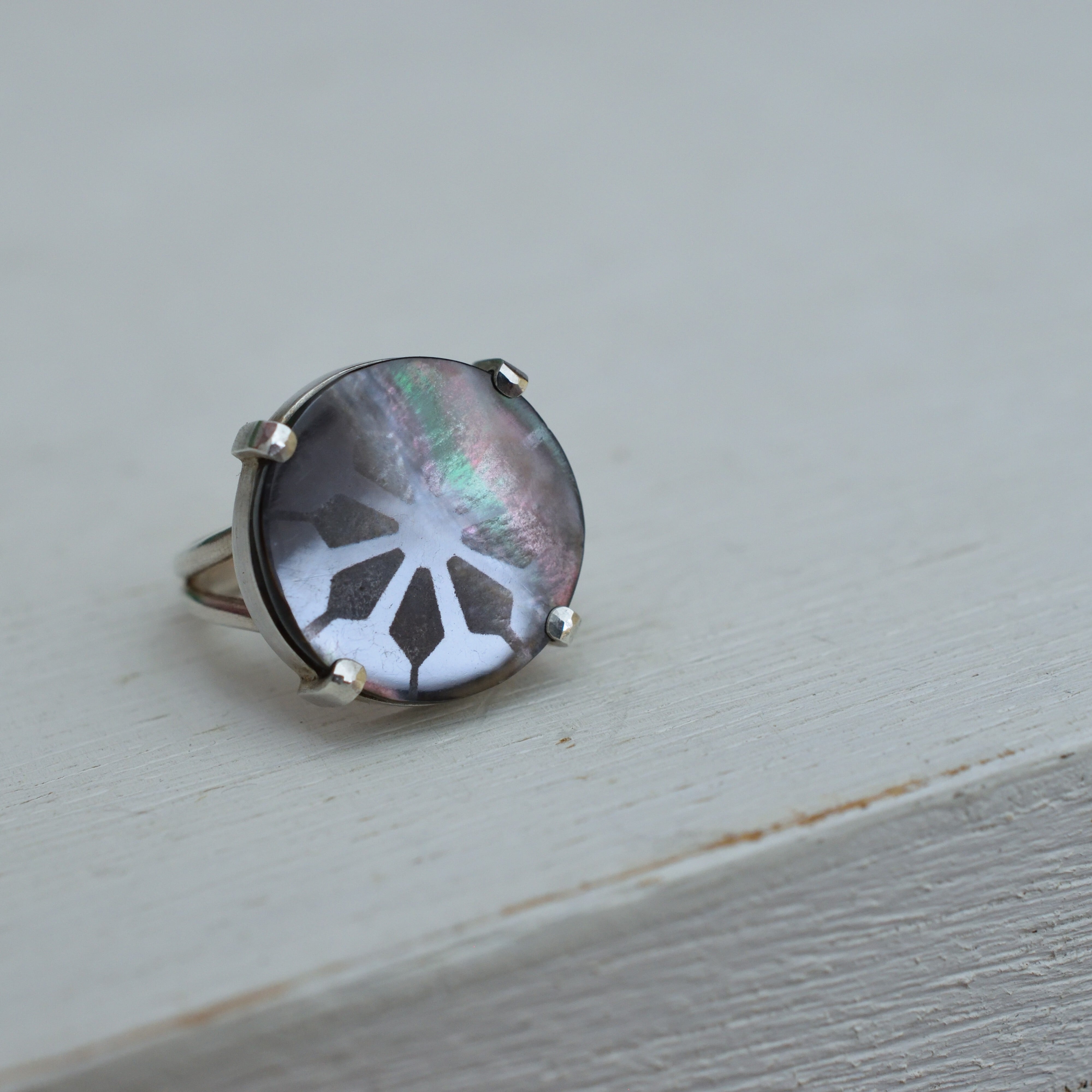 磨き上げた蝶貝(MOP)に日本の伝統文様を刻み込んだつや消し仕上げのシルバーリング。