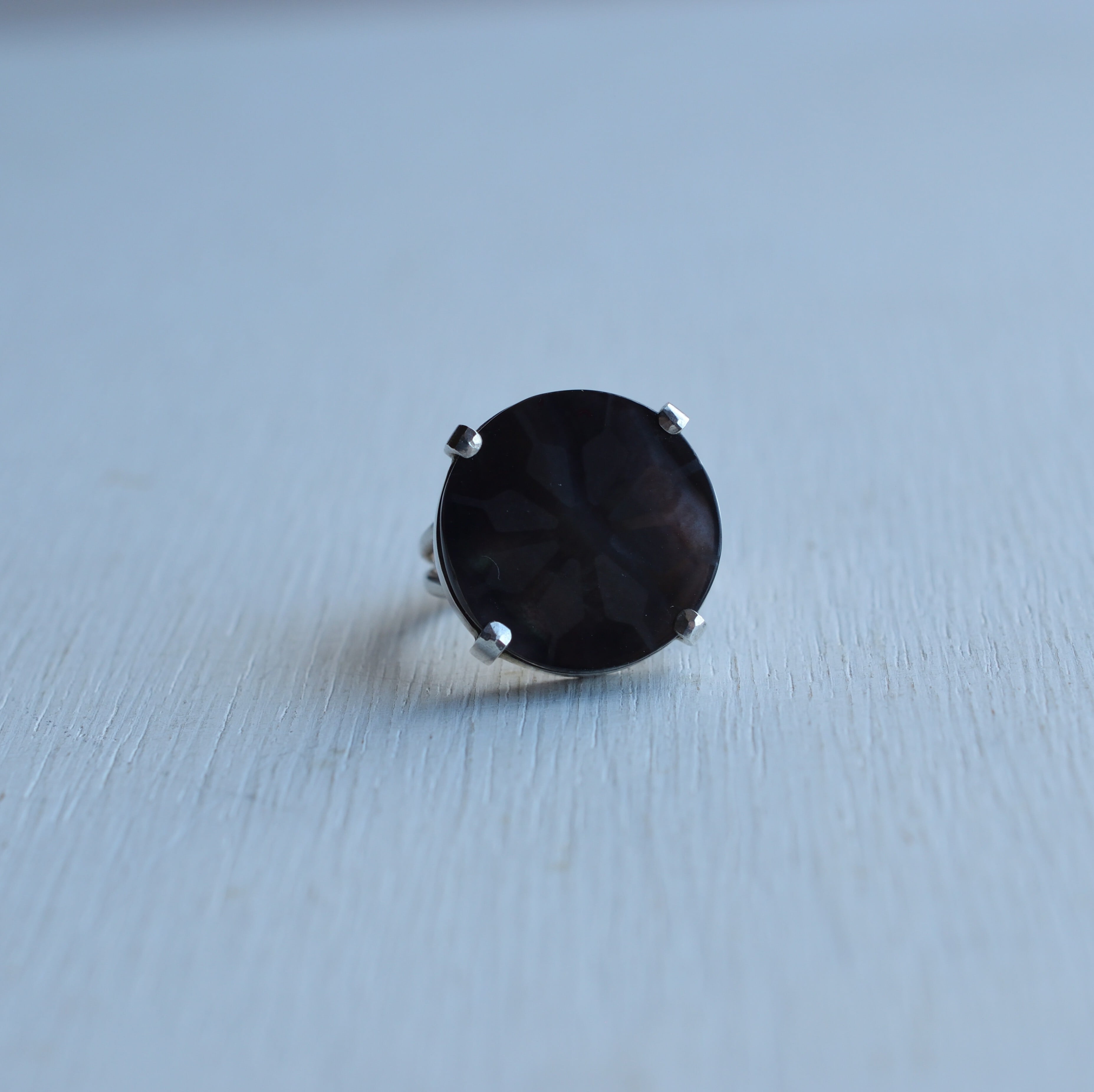 【黒蝶貝】黒真珠を育てる母貝。奄美大島から仕入れた貝を使用しています。漆黒の光、角度によっては虹色の光りを放ちます。シックで金属との相性がとてもいい貝だと思います。国産の黒蝶貝は希少です。
