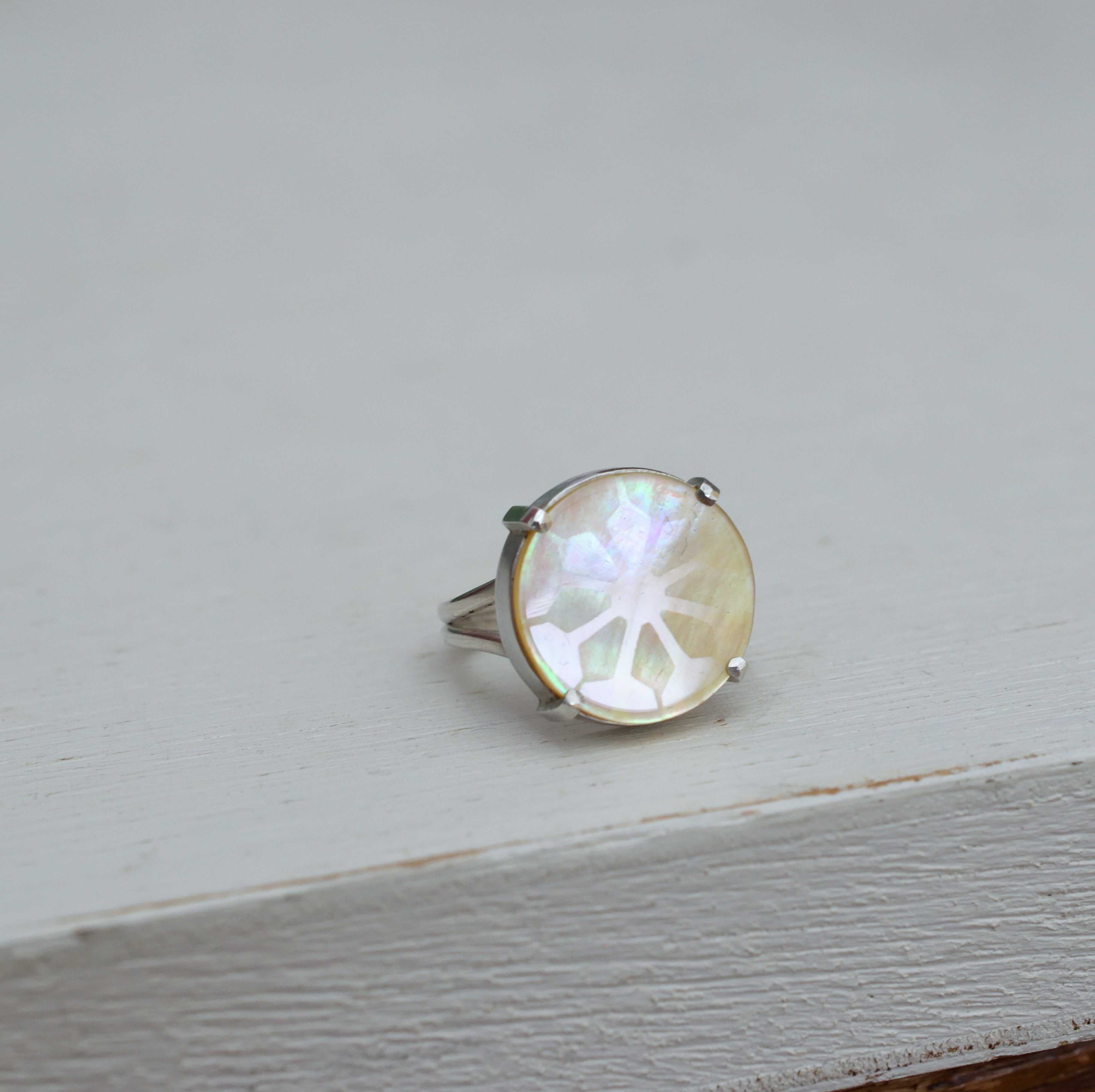角度によって文様が現われ、MOP独特の光を放ちます。