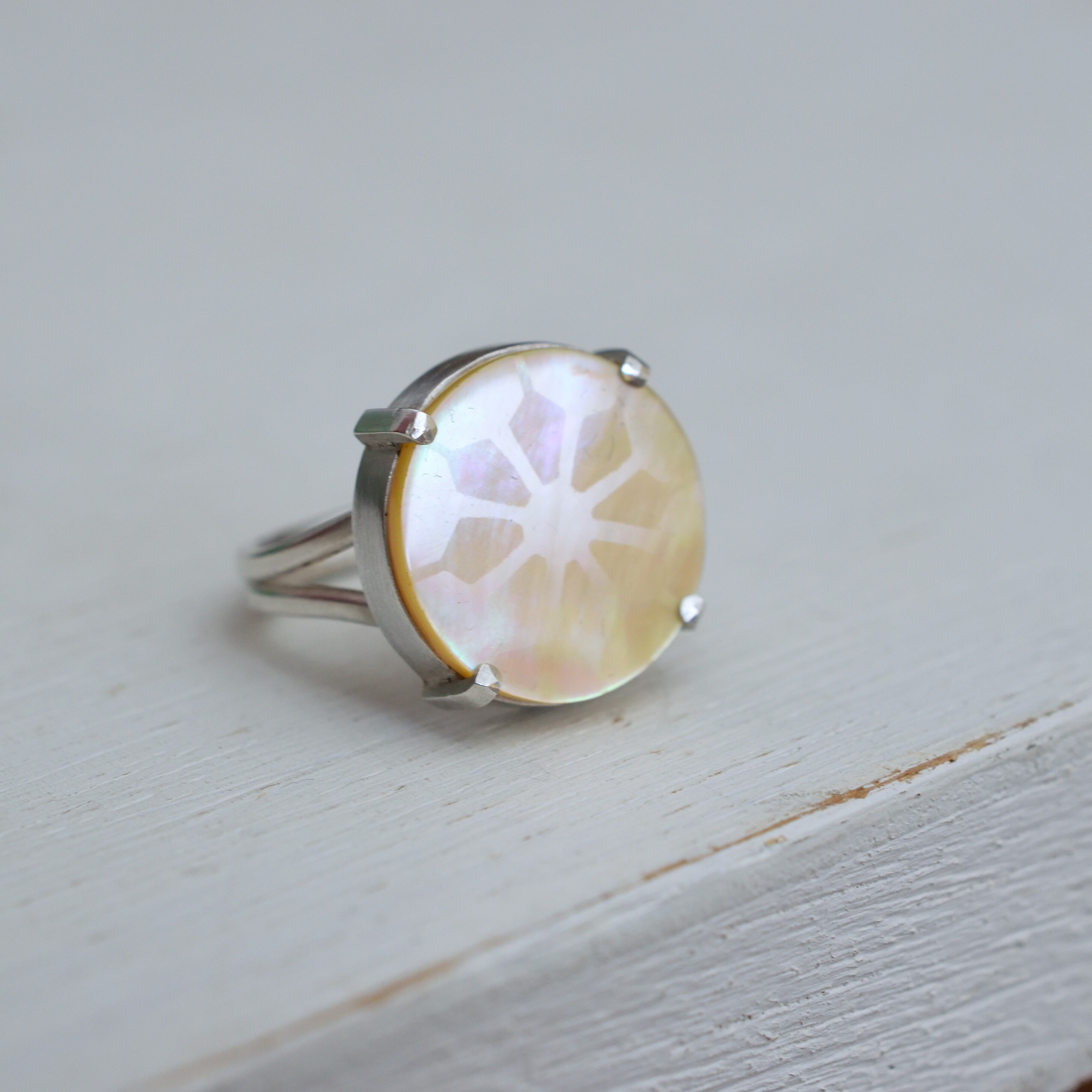 磨き上げた蝶貝(MOP)に日本の伝統文様を刻み込んだつや消し仕上げのシルバーリング。