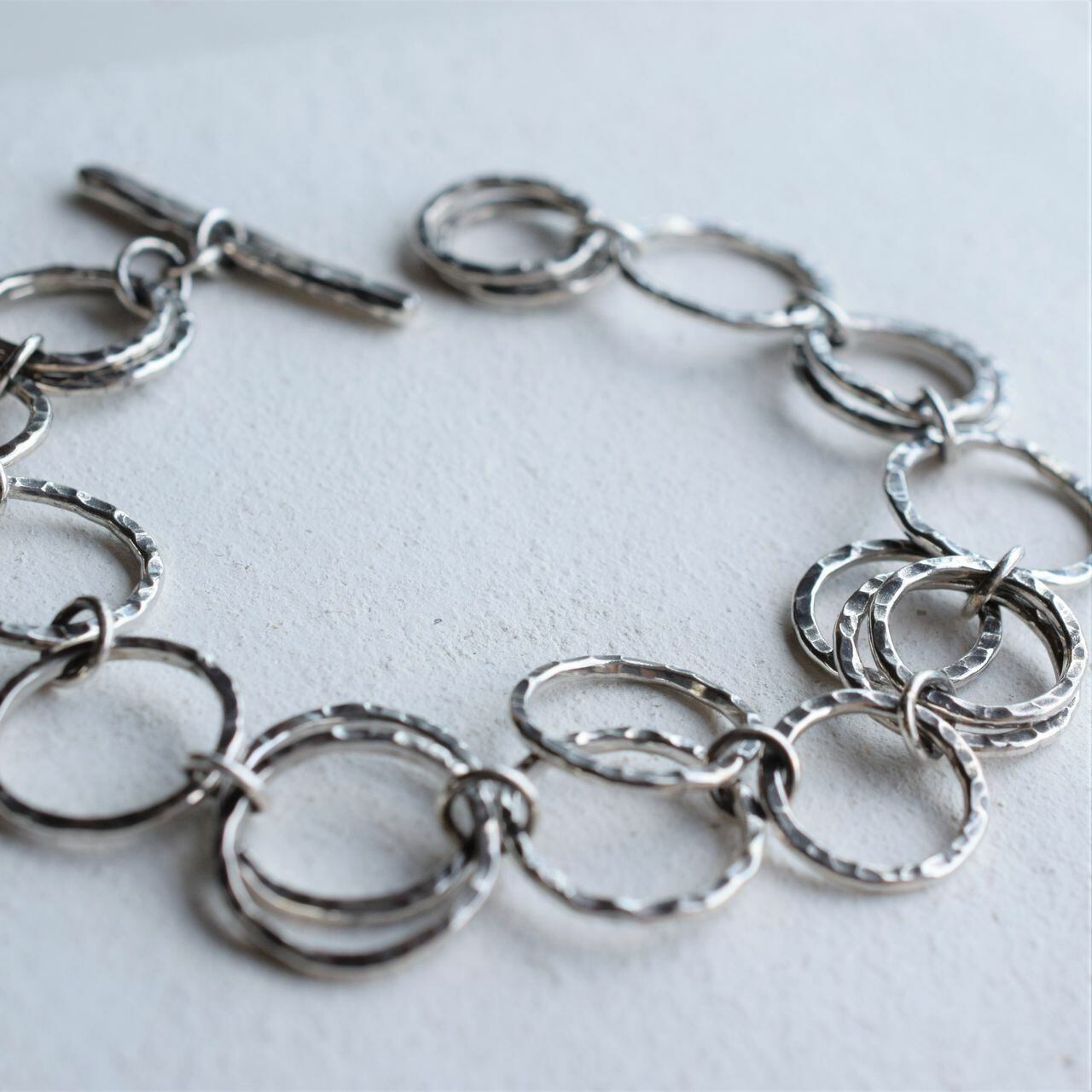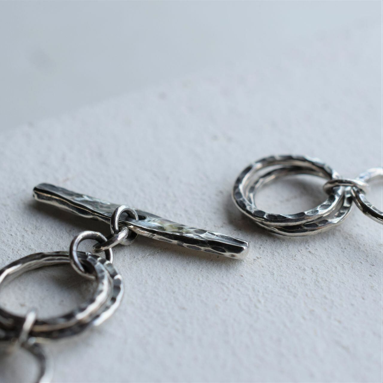 銀線からリングを1個ずつ作り、テクスチャーを加えたパーツを更に繋げていき制作しています。リングとリングを繋ぐカンもロウ付けしているので強度もあります。